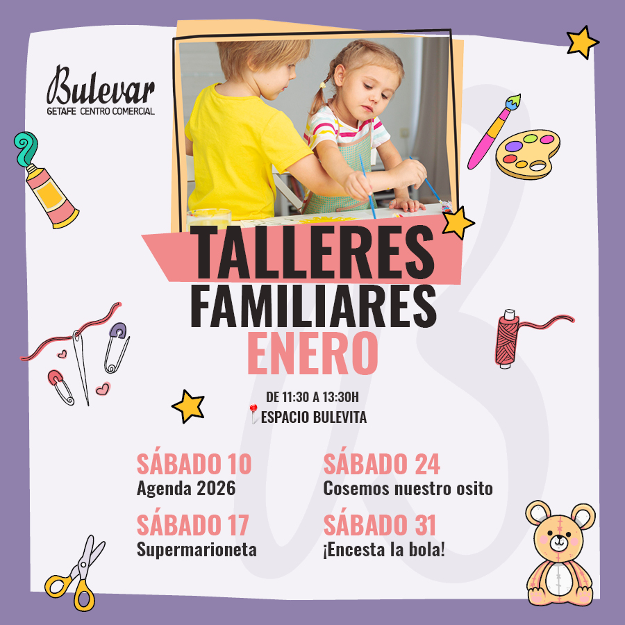 Con el inicio del nuevo año, en Bulevar Getafe retomamos nuestros talleres familiares gratuitos, una propuesta pensada para que los más pequeños disfruten de actividades creativas y educativas durante los fines de semana.
