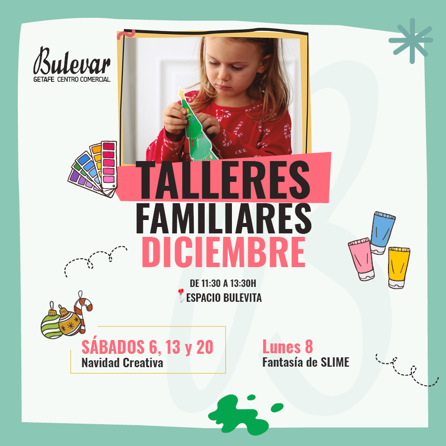 En Bulevar Getafe seguimos llenando los fines de semana de imaginación, color y diversión en familia. Durante el mes de diciembre, nuestros talleres gratuitos vuelven en su horario habitual, cada día de actividad de 11:30 a 13:30 h en el Espacio Bulevita, un lugar pensado para que los más pequeños aprendan, creen y se lo pasen en grande.